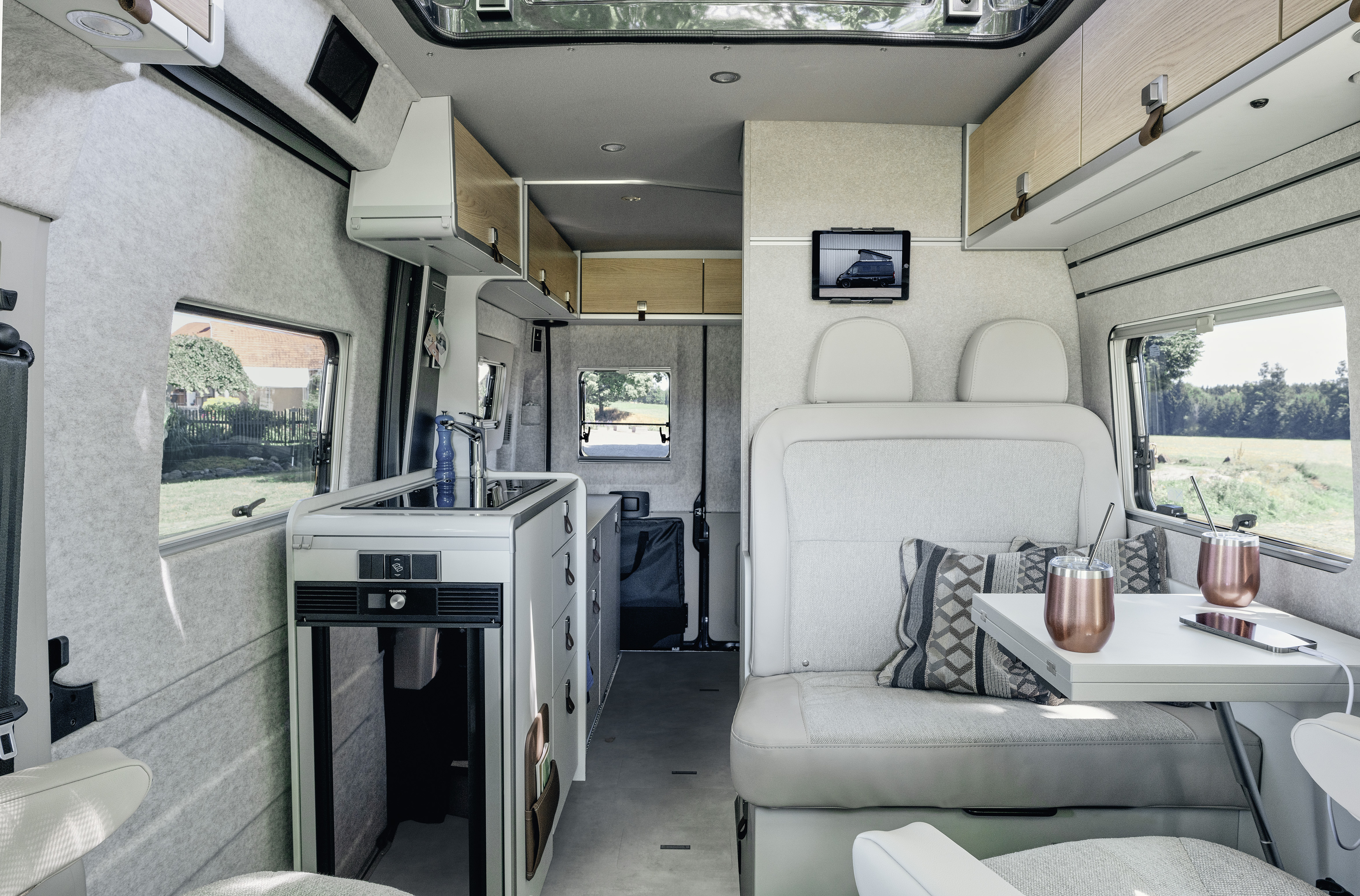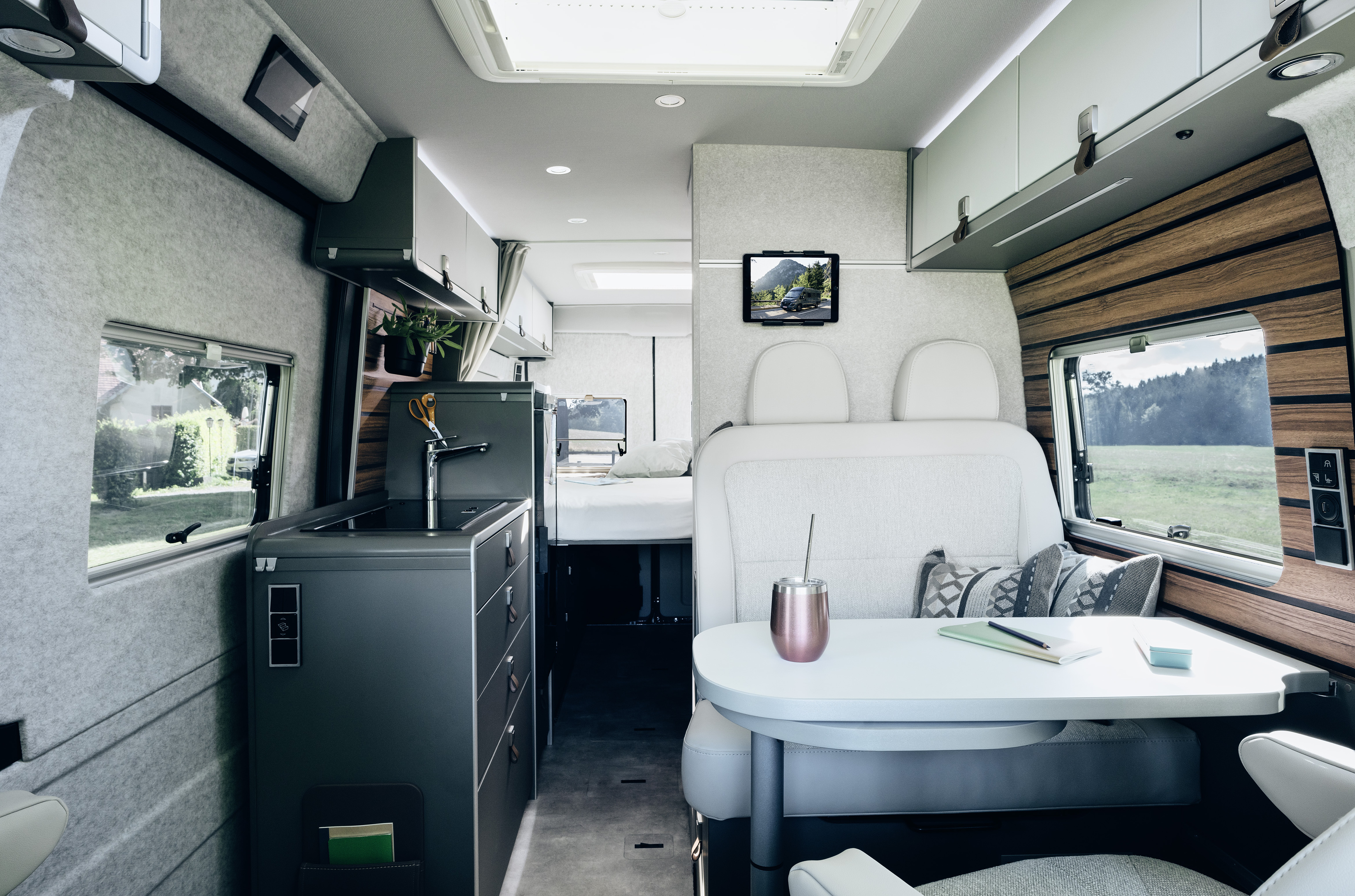 Les nouvelles fonctionnalités comprennent également le premier concept d'éclairage complet à quatre niveaux dans un camper van, qui contribue à créer une atmosphère de bien-être à l'intérieur du véhicule. Tous les éclairages sont dotés d'une fonction blanc chaud/froid et d'un variateur d’intensité et offrent une lumière toujours adaptée dans le séjour et la cuisine. Pour la première fois, des liseuses à commande tactile sont également installées au-dessus des sièges de cabine. Les clients ont également la possibilité de choisir un pack Éclairage comprenant une lampe suspendue innovante et des lampes modulables pour les parois multifonctions.