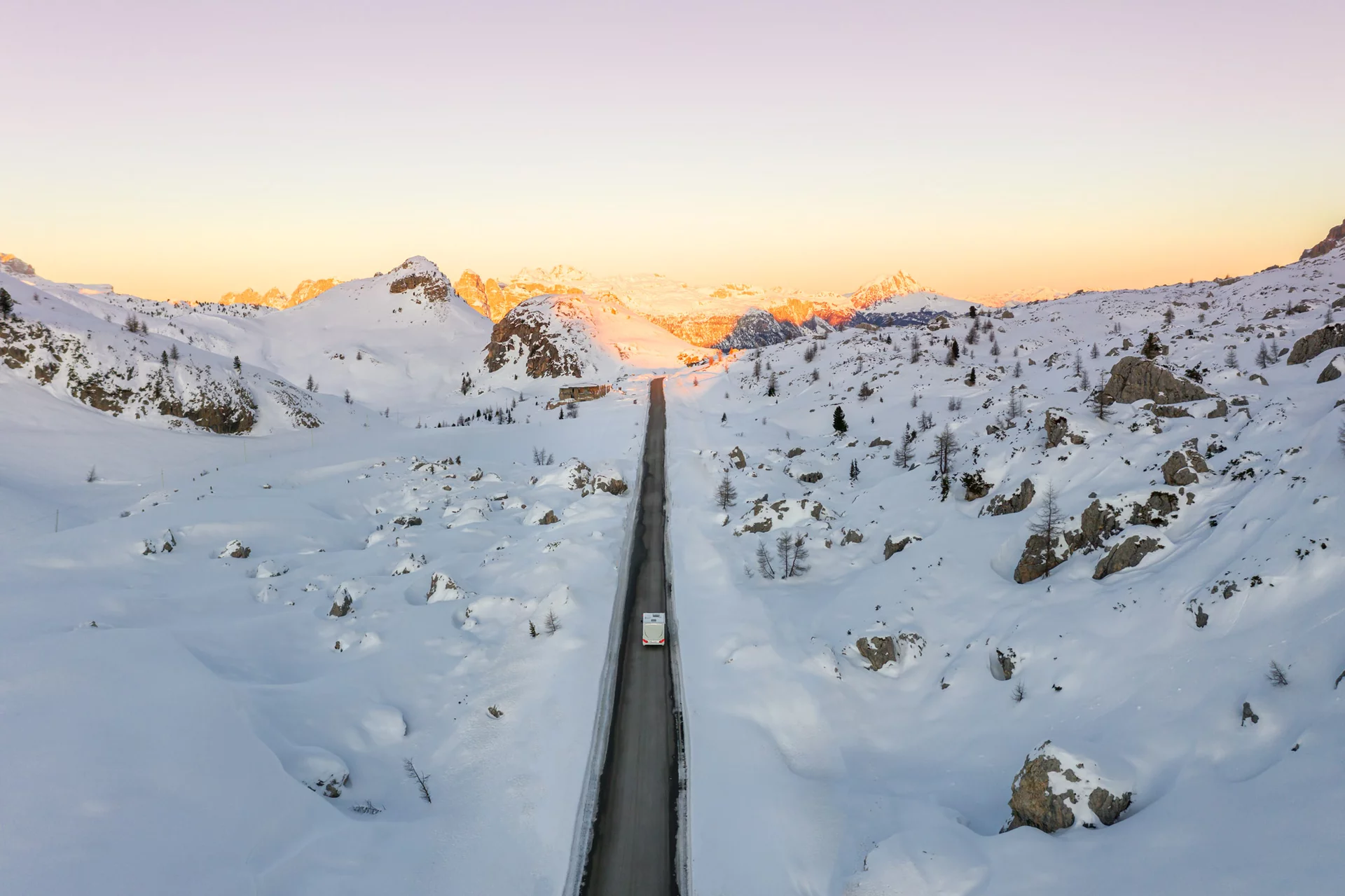 Après des journées magnifiques dans la poudreuse fraîche, Simon prend la direction de Cortina d'Ampezzo, toujours dans les Dolomites en Italie, à bord de l'HYMER ML-T. Le réapprovisionnement est fait et le réfrigérateur de 142 litres du camping-car est rempli à ras bord.