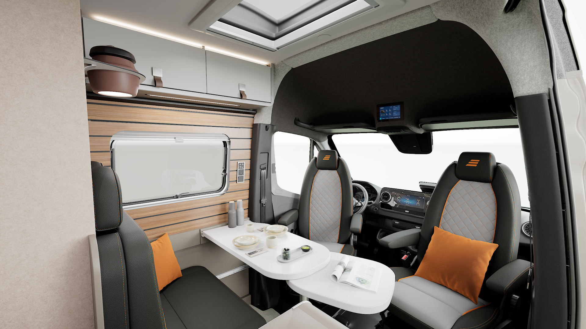 Het meubeldecor “Matara Olive” combineert warme houtaccenten met een matte olijftint en een moderne vloerafwerking in betonlook: minimalistisch, eigentijds en slijtvast. Aan de buitenzijde benadrukken fijn afgestemde designdetails en de optionele lak in Stone Grey de zelfverzekerde uitstraling van de camper.