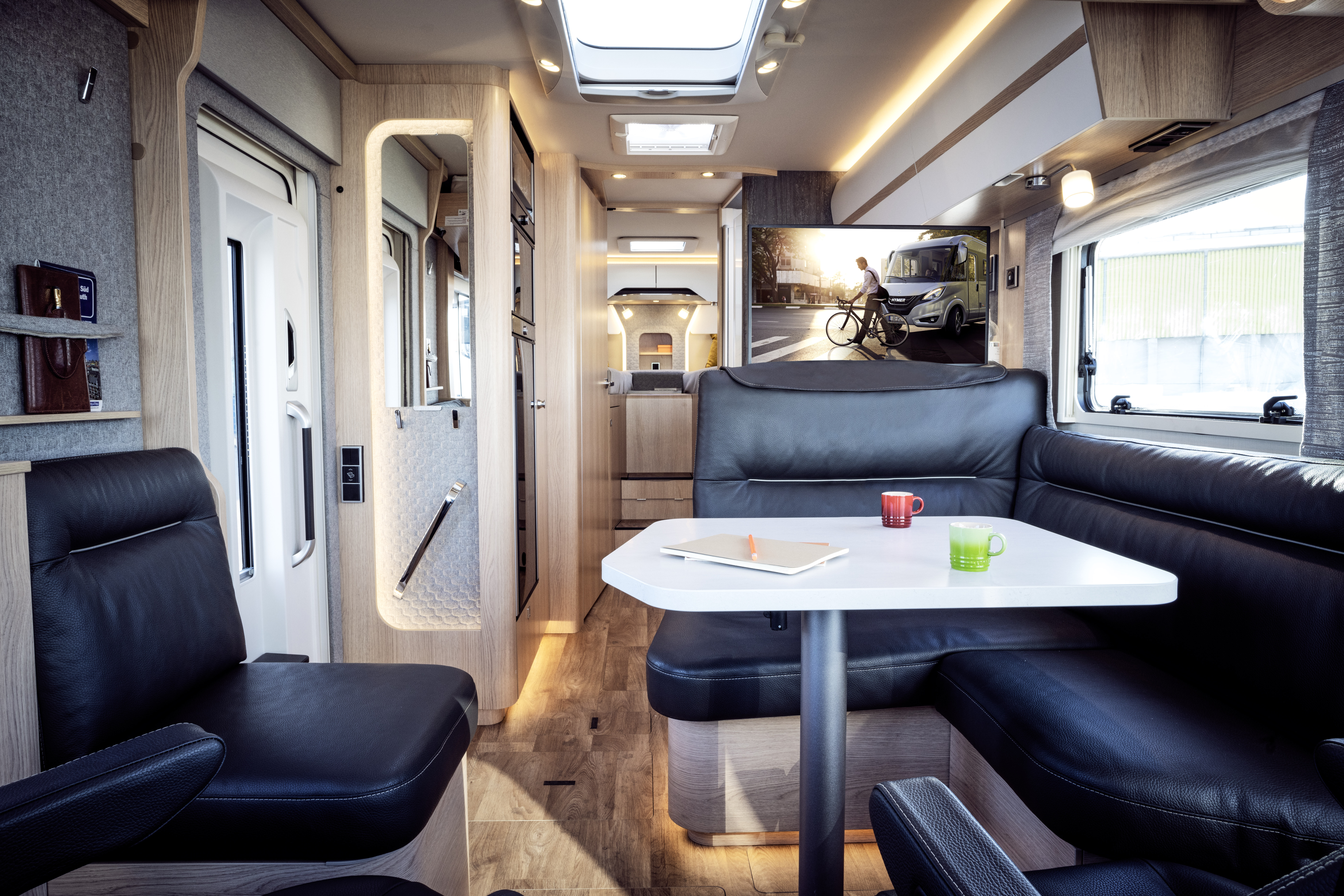 Auch das stimmige Raumdesign im Inneren lebt von der modernen Geradlinigkeit. Das helle Möbeldekor wird mit Wohnelementen in matt-weiß kombiniert oder wahlweise durch dunkle Farbakzente mit dem Dekor Velvet Ash aufgebrochen. Daraus entsteht ein offenes Raumgefühl mit einem elegant-cleanen Look, der sich einheitlich im gesamten Wohnraum, dem Bad und auch der Küche wiederfindet. Eine hochwertige Innenausstattung mit Details aus abgestepptem Wollstoff an der Garderobe und in den Wandverkleidungen sowie einer integrierten Mehrebenen-Ambientebeleuchtung an den Dachstauschränken, unter der Küchentheke sowie am Sockel sorgen für besonderen Komfort. Diese Kombination aus durchdachter Funktionalität, edlen Materialien und einem Höchstmaß an Komfort wurde auch von der fachkundigen Jury besonders positiv wahrgenommen.