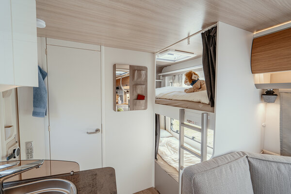 Ab sofort ist der Eriba Nova 565 in den beiden Ausstattungslinien „Trend“ und „Ambience“ im Handel erhältlich. Die beliebte Nova-Baureihe zeichnet sich durch eine innovative CLIMADUR Aufbautechnik mit besten Isolationseigenschaften sowie die Nova-typische runde Formgebung aus. Der Grundriss 565 überzeugt mit einem großen Doppelbett, das sich mit einem halbhohen Raumtrenner separieren lässt, einem geräumigen Bad mit separater Dusche, bis zu drei Etagenbetten sowie einer gemütlichen Rundsitzgruppe. Unter dem Doppelbett und dank der großen Garagenklappe sowie hochklappbarem Etagenbett, bietet der neue Grundriss auch für sperrige Gegenstände viel Stauraum und eignet sich besonders für bis zu fünfköpfige Familien.