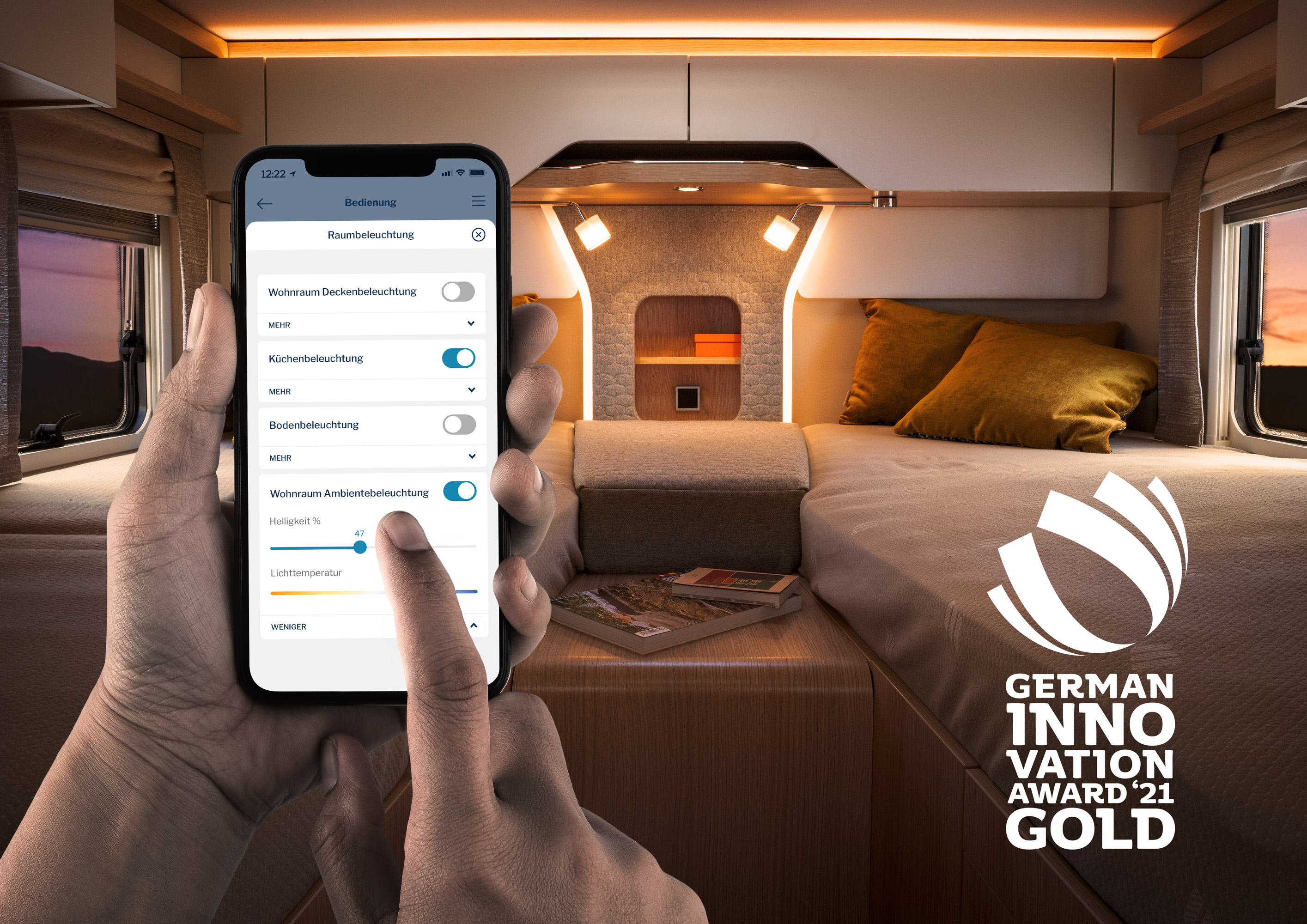 Das Lichtkonzept betrachtet den Wohnraum nicht als abgeschlossene Raumelemente, sondern als Raumfluss, der durch die richtige Ausleuchtung geschickt unterstützt wird. Dafür sorgt die per App ansteuerbare Mehrebenen-Ambientebeleuchtung inkl. Sockelbeleuchtung, die den Innenraum so weitläufig und großzügig wie niemals zuvor wirken lässt.