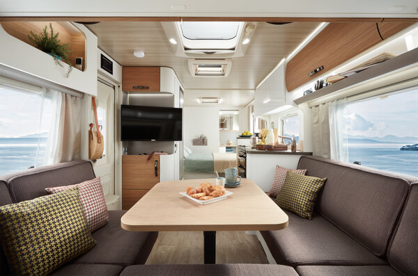 The Eriba Nova 590 in the two model lines "Trend" and "Ambience" is now available in retail. As part of the popular Nova series it is characterised by an innovative CLIMADUR body shell design with outstanding insulation values as well as the Nova characteristic curves. Layout 590 also offers plenty of storage space, a large kitchen unit, a spacious rear bathroom with convenient separate shower and a comfortable seating area.