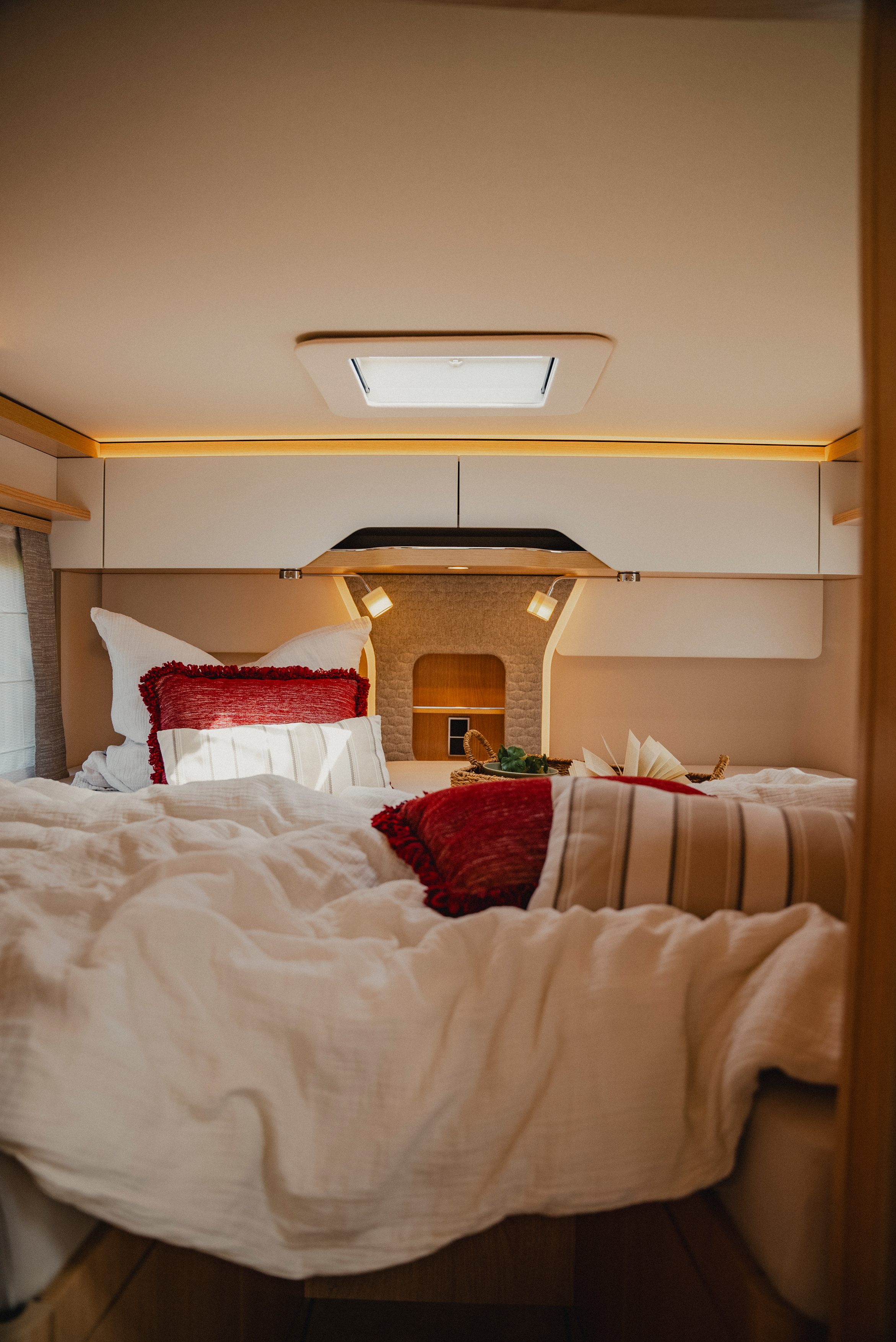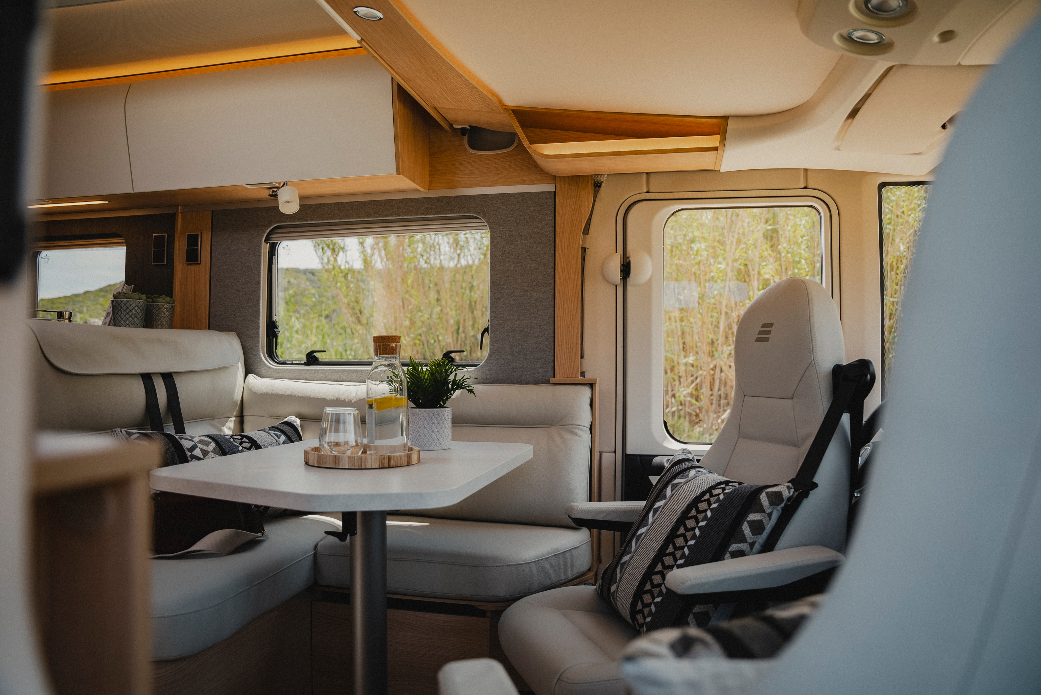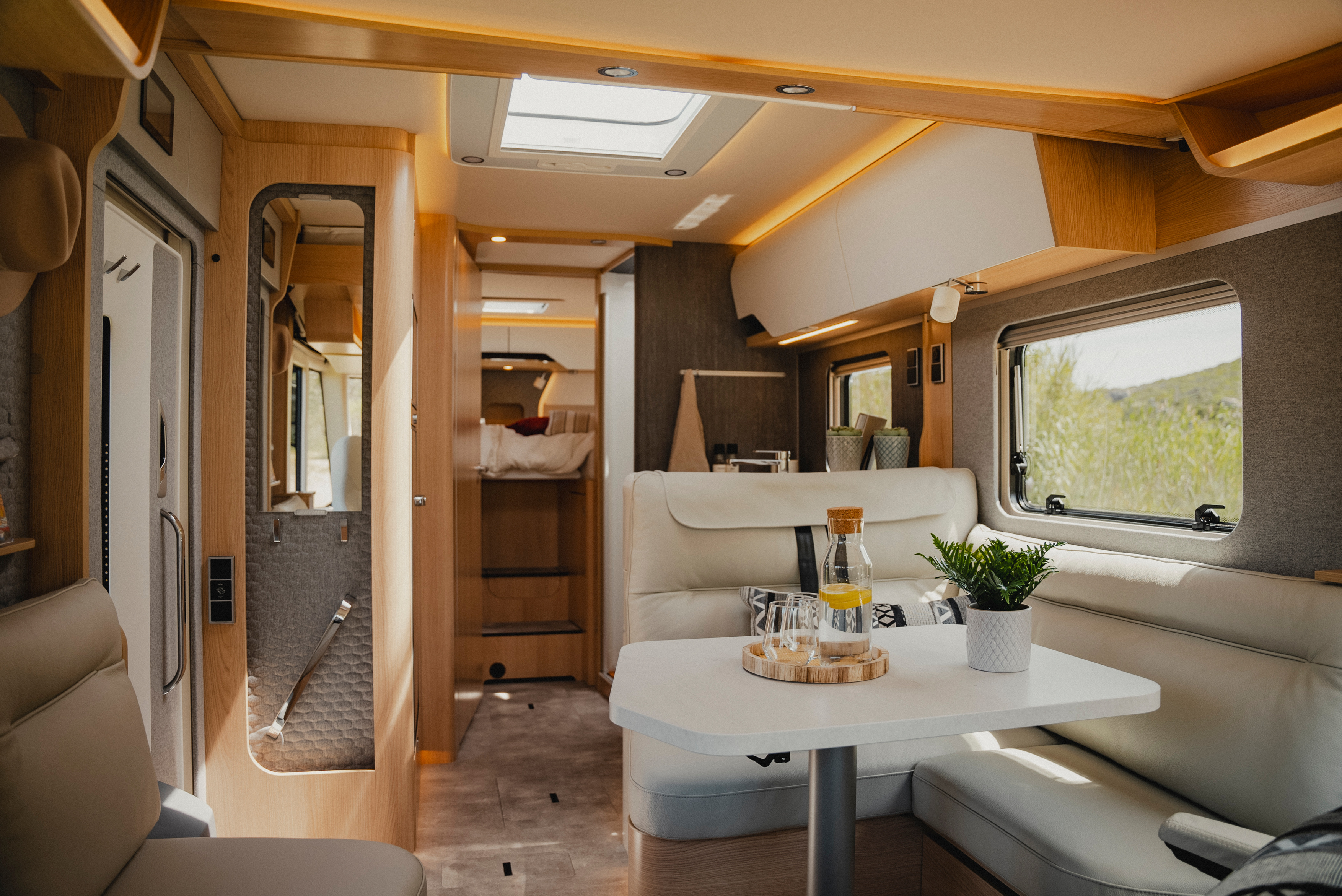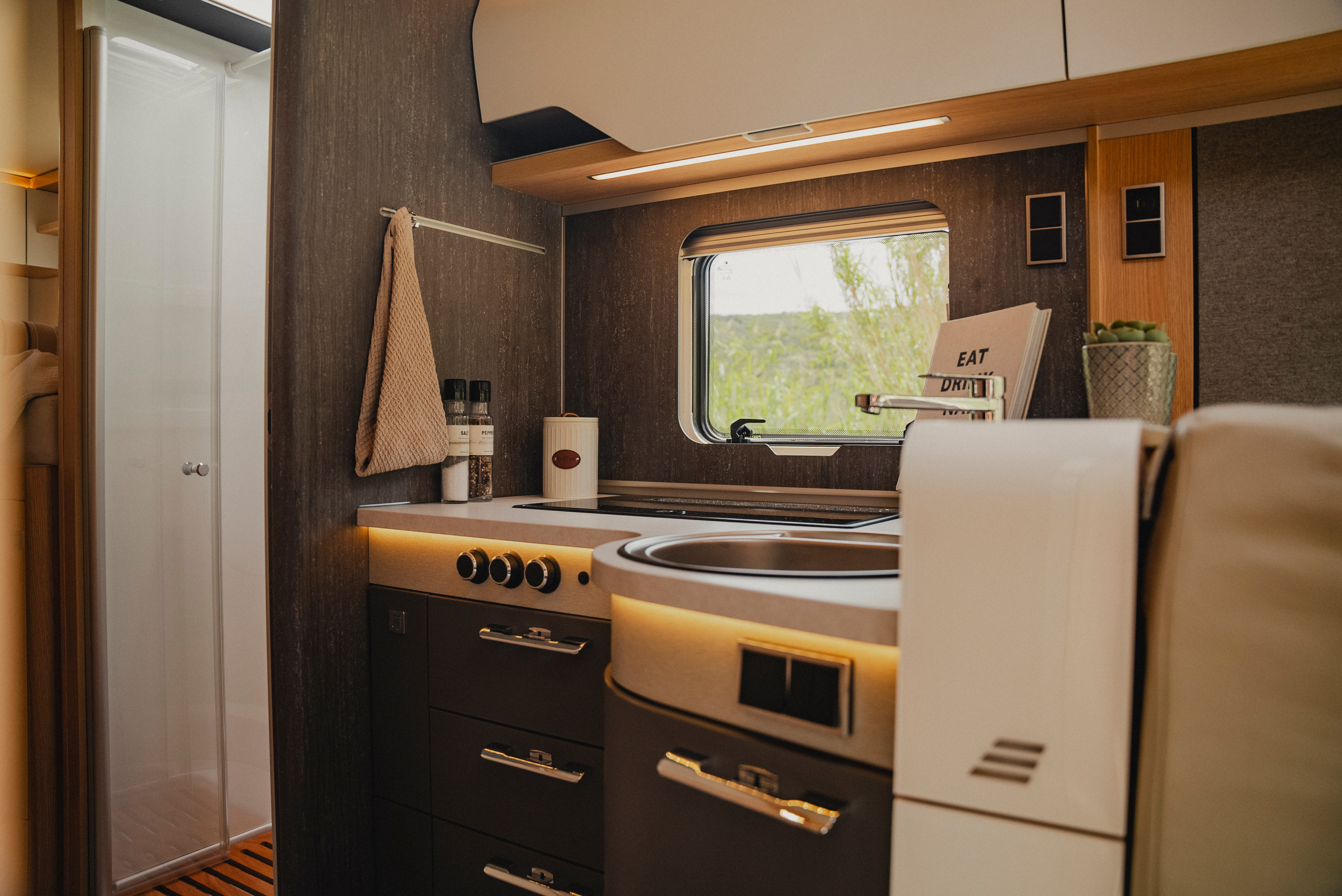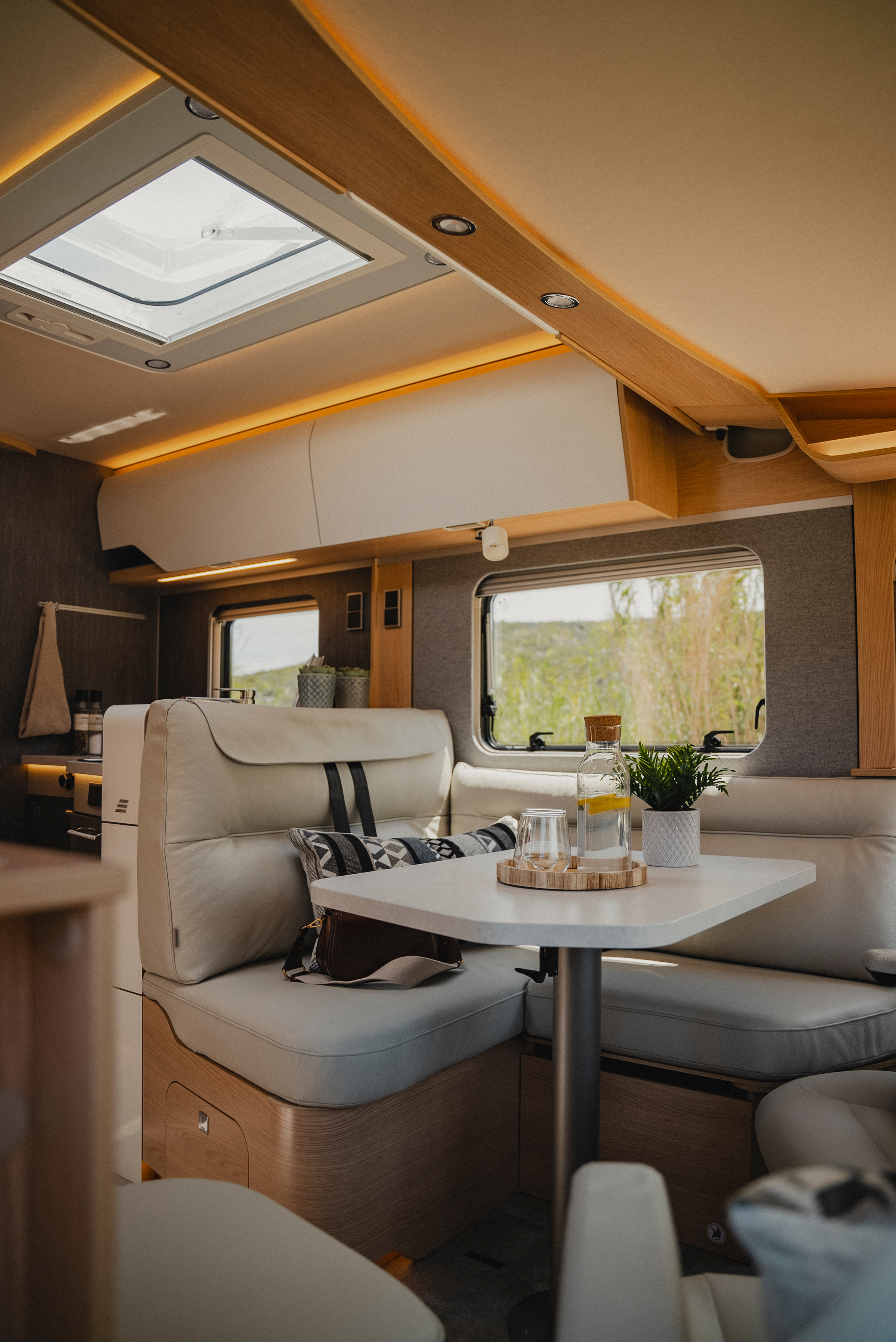 Functionally, the interior also presents itself at the highest level: An electric roller shutter in the front area, a precise water level indicator with 1-percent steps, and a modern equipped kitchen with generous storage space and thoughtful lighting staging make traveling not only comfortable but stylish.