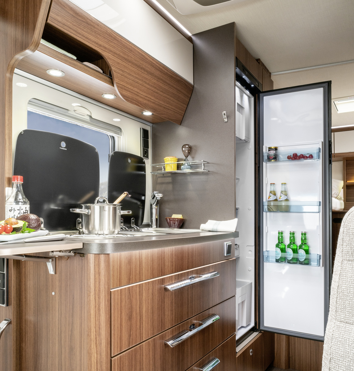 After extended ski tours, a warm motorhome awaits you in the evening - thanks to the gas-powered warm air heating with an integrated timer. It feels a bit like coming home. And fresh coffee tastes even better in the cozy warmth. You can satisfy your appetite after a strenuous day with home-cooked dishes from the motorhome’s kitchen and relax for the next tour in the large, comfortable bed in the rear of the HYMER.