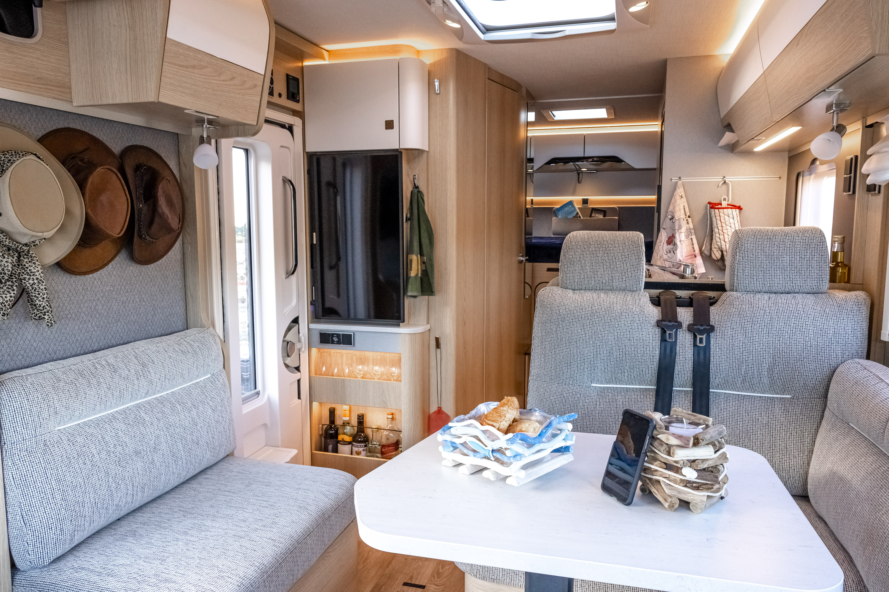 After almost an hour of total driving time over hills, narrow bridges and small sand dunes, the next destination is reached, and nothing stands in the way of wonderful surfing lessons. Where other holidaymakers have to make their way home after exercising, a delicious dinner with freshly roasted fillet and accompanying wine awaits in the HYMER kitchen near the beach. It was prepared with love and teamwork in the mobile kitchen. A subsequent film evening on the fold-out 32 "LED flat screen offers the perfect end to an eventful day, as the photos and video recordings taken over the last few days are wonderful to relive here.