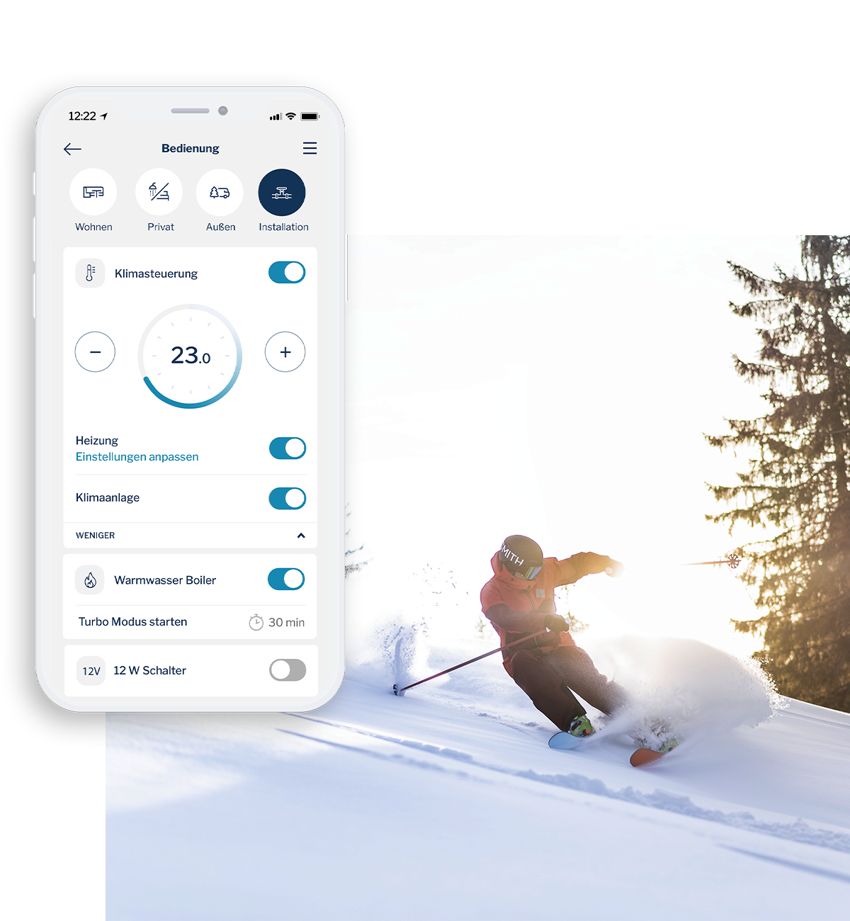 Imaginez que vous êtes en haut des pistes, prêt pour la dernière descente. En bas de la station, votre HYMER vous attend. Frigorifié par une journée de ski, vous vous réjouissez à l'idée de retrouver un camping-car ou fourgon douillet. Vous sortez rapidement votre smartphone et vous activez le scénario parfait en un seul clic. Votre HYMER amène l'intérieur à votre température de confort, chauffe l'eau pour la douche et crée un éclairage d'ambiance agréable et cosy.