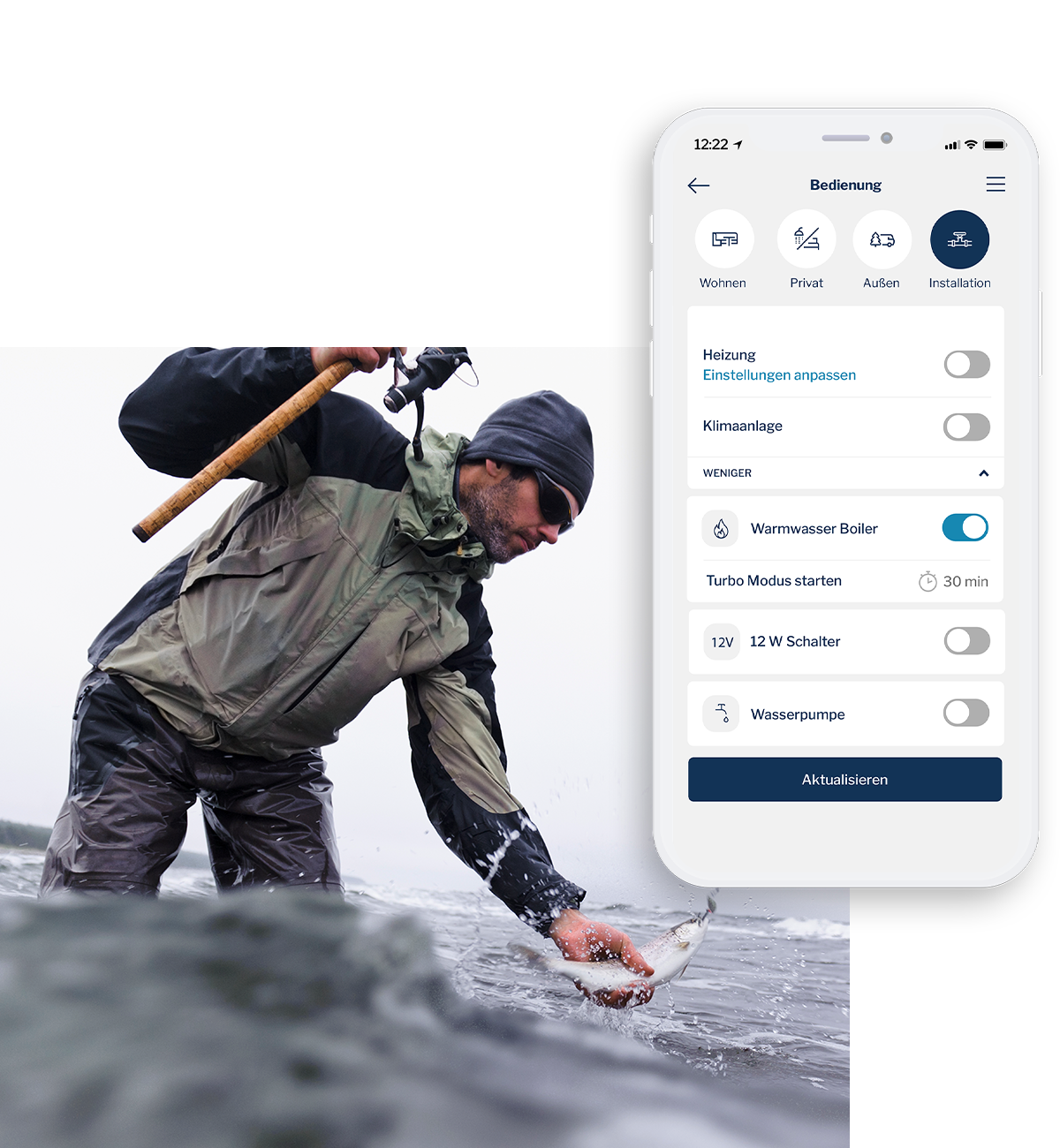La nature, la tranquillité et de chouettes discussions – pour beaucoup d’entre nous, la pêche entre amis représente la détente à l’état pur. Qu’il vente ou qu’il pleuve, nous sommes à l’affût d’une belle prise et le froid ne nous gêne nullement. Surtout pas quand nous allumons à l’avance le chauffage et le chauffe-eau de notre HYMER via l’appli. On peut donc sauter sous la douche chaude en arrivant. Et le saumon pêché ? En son honneur, on va immédiatement baisser la température du réfrigérateur.