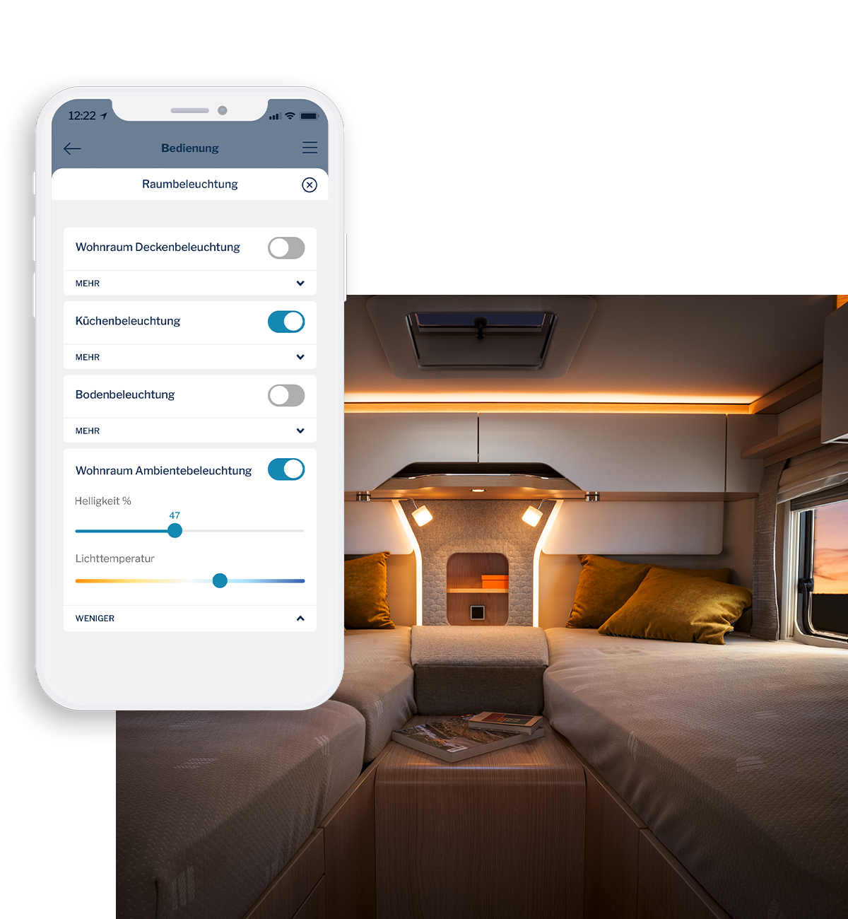 L’appli HYMER Connect dispose de scénarios préinstallés que vous pouvez bien sûr personnaliser. Ainsi, vous pourrez créer au moment choisi une ambiance cosy selon vos préférences. Que ce soit en rentrant après une escapade en plein air ou tout simplement pour composer un bel éclairage d’ambiance matin et soir.