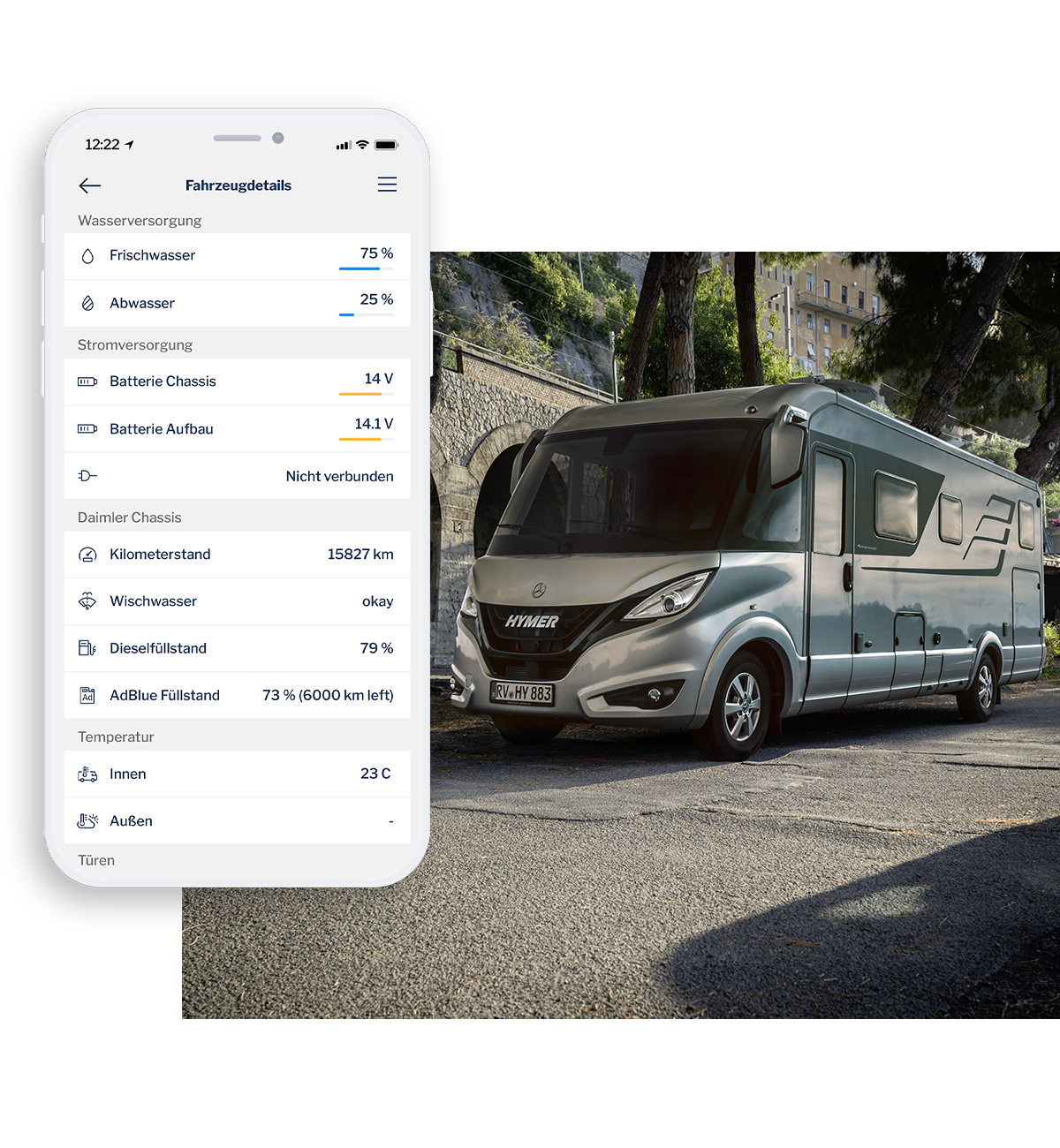 D’autres applications et offres actuellement sur le marché n’offrent que des solutions partielles pour la mise en réseau et le contrôle des composants, de sorte que le client a besoin d’un certain nombre d’applis et de panneaux de commande différents pour piloter les divers éléments. Avec l’appli HYMER Connect, nous poursuivons une approche unique et pleinement intégrée : la société Hymer GmbH & Co. KG réunit de nombreux composants du véhicule en un écosystème intelligent qui permet leur contrôle confortable via smartphone. Grâce au partenariat stratégique de longue date avec Mercedes-Benz, HYMER comme tout premier constructeur de cellules a accès aux données moteur du véhicule.