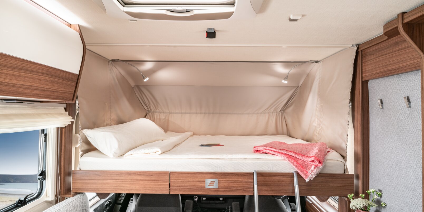 Experience luxurious comfort with a stylishly equipped sleeping area, complemented by modern overhead storage cabinets in wood finish, here in Rochefort walnut. The combination of natural light and warm lighting creates an atmosphere of relaxation and elegance for your travels.