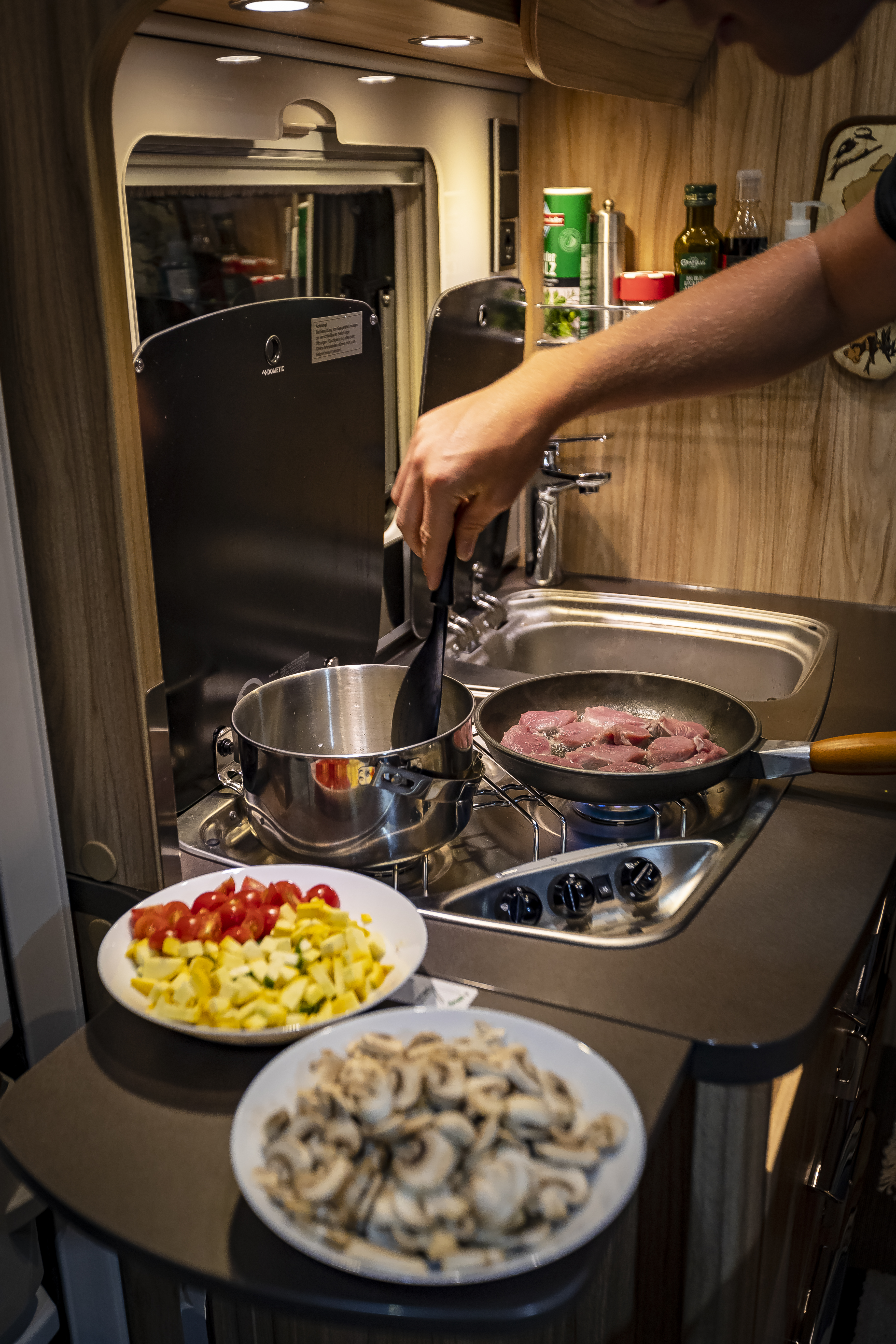 Una piccola piazzola accanto alla strada con vista sul mare è il posto perfetto per goderci una cena preparata da noi nella grande cucina del ML-T 570. Anche stavolta la fine della giornata assomiglia al suo inizio: cibo delizioso, stavolta in alto, con vista sulla spiaggia.