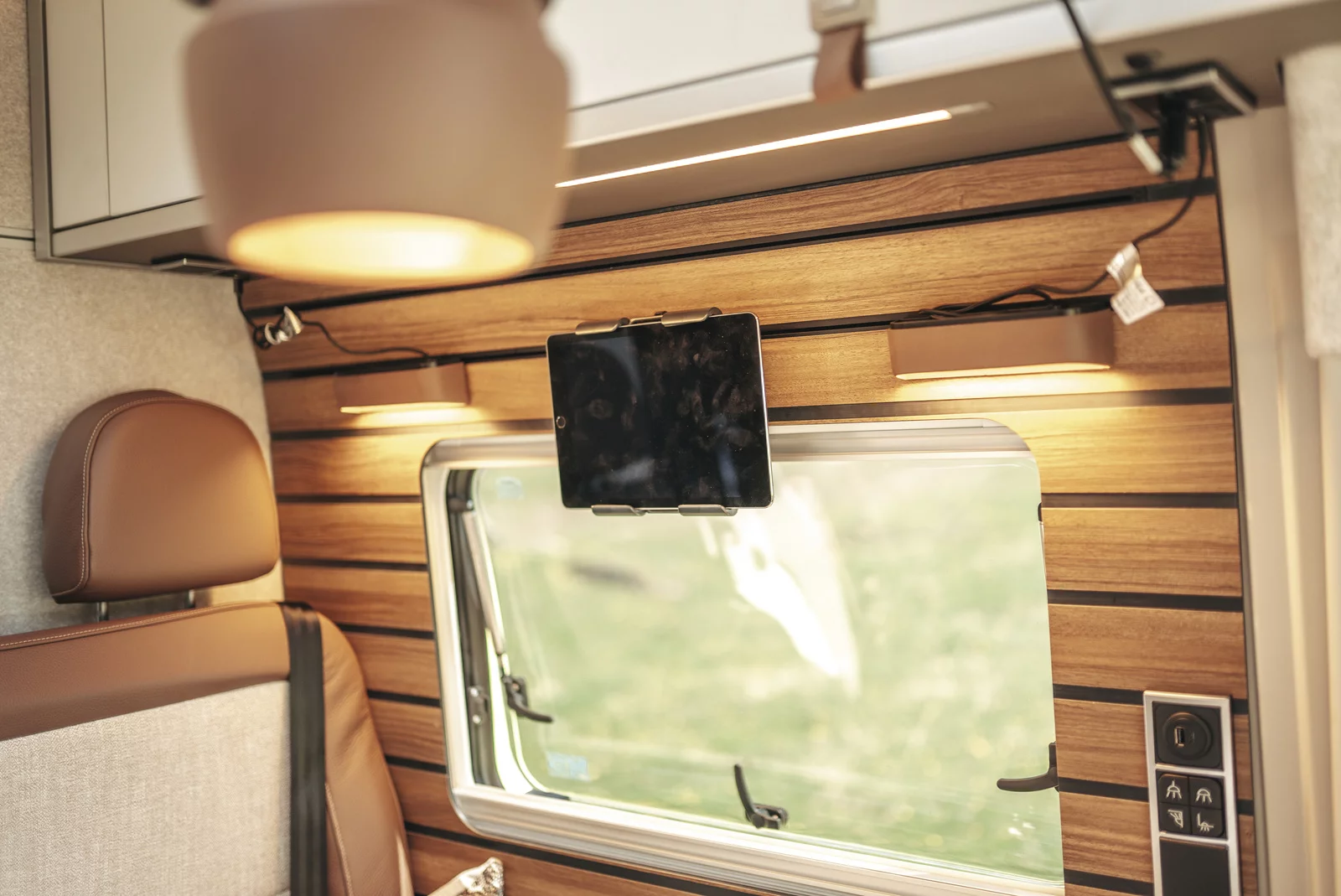 Her testet vi for første gang HYMER Connect-appen og skapte en koselig atmosfære i bilen. Appen skulle dessuten vise seg å være svært praktisk litt senere denne kvelden. Etter et restaurantbesøk ble vi nemlig overrasket av et tordenvær.